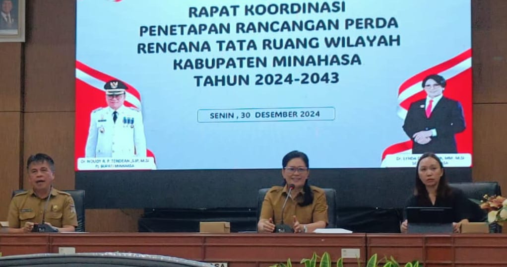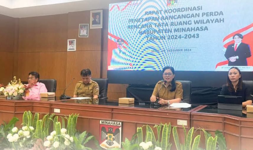 Minahasa — Sekretaris Daerah Kabupaten Minahasa, Dr. Lynda D. Watania, MM, M.Si, memimpin Rapat Koordinasi (Rakor) Penetapan Rancangan Peraturan Daerah (Ranperda) tentang Rencana Tata Ruang Wilayah (RTRW) Kabupaten Minahasa Tahun 2024-2043. Kegiatan ini berlangsung di Ruang Sidang Kantor Bupati Minahasa pada Senin (30/12/2024).